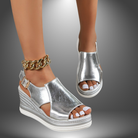 Questi sandali con zeppa uniscono comfort e glamour grazie alla loro finitura metallizzata e il design moderno.