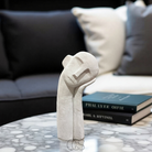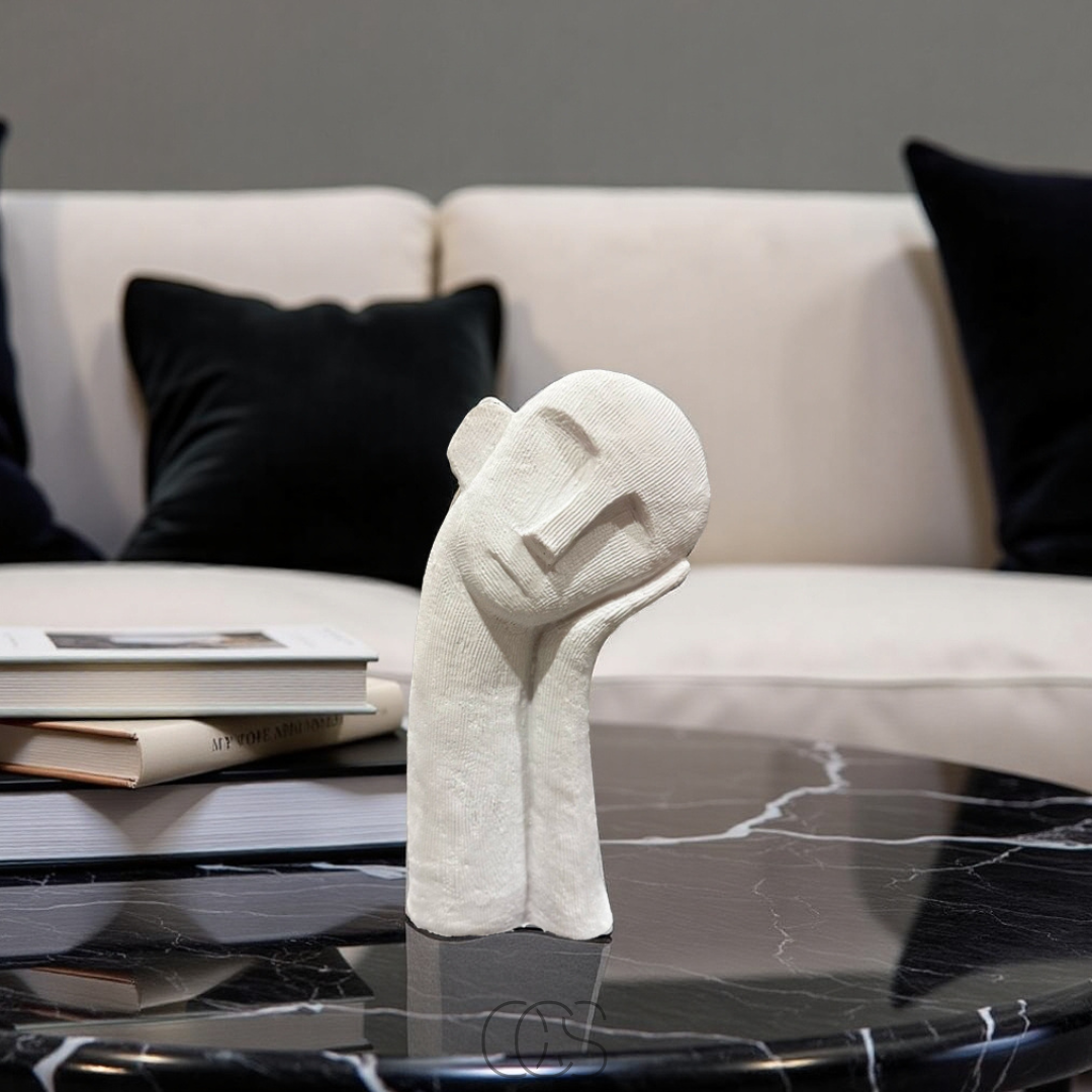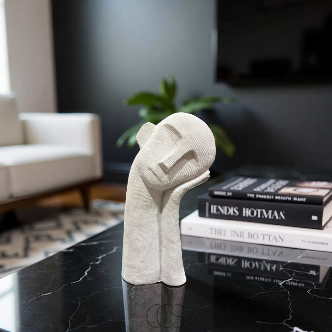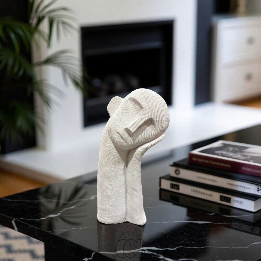 Questa scultura moderna dal volto pensieroso è una decorazione perfetta per spazi raffinati e minimalisti.