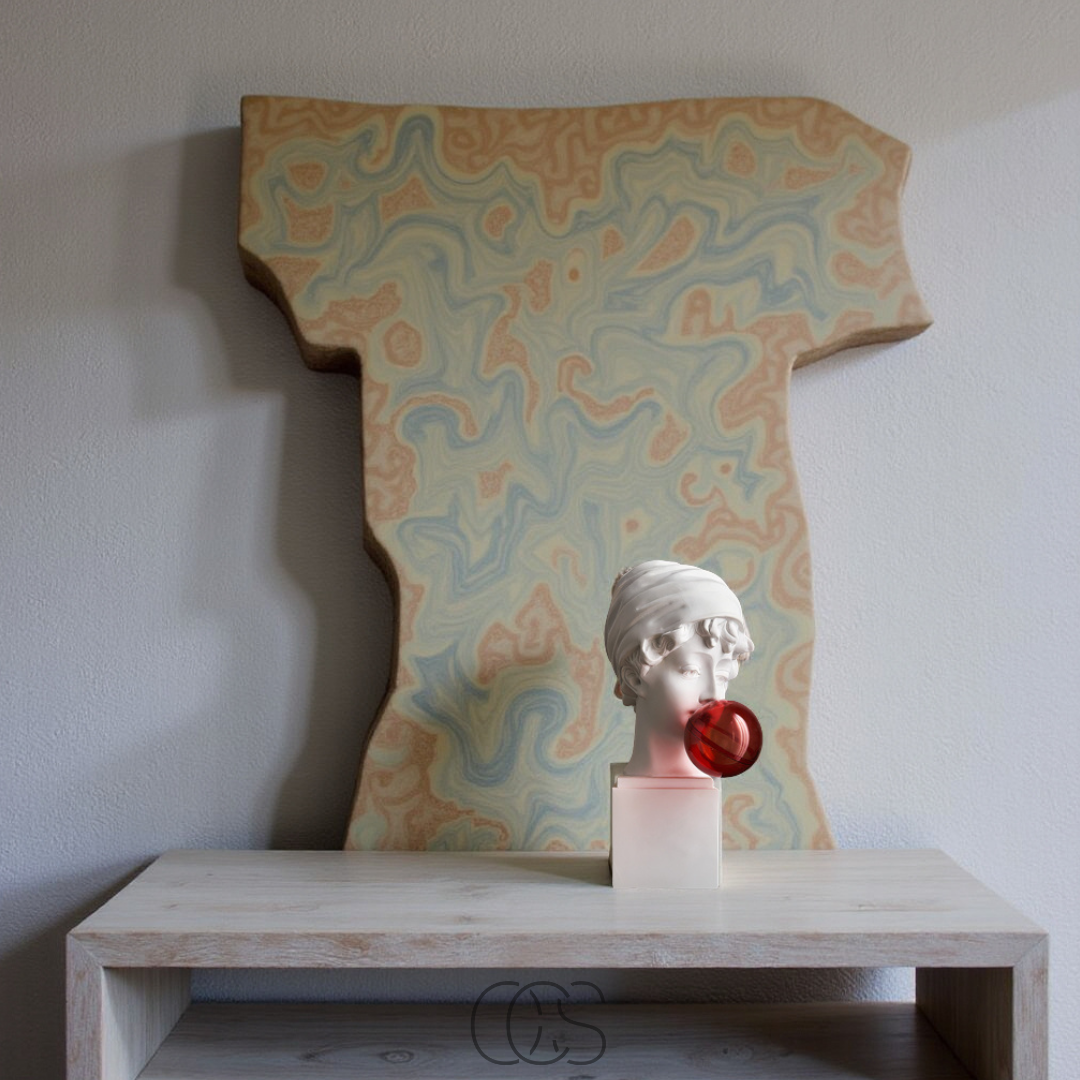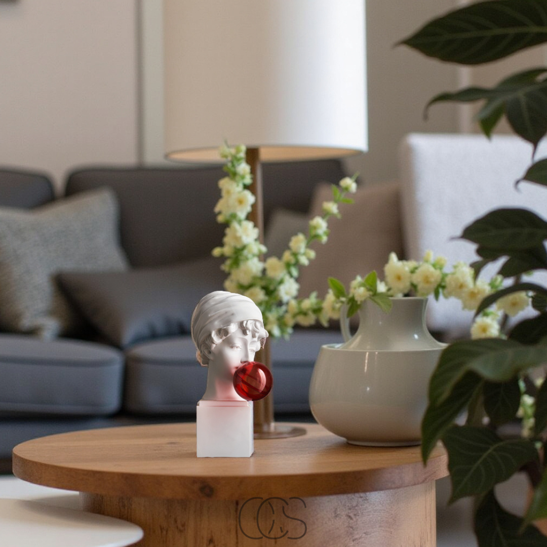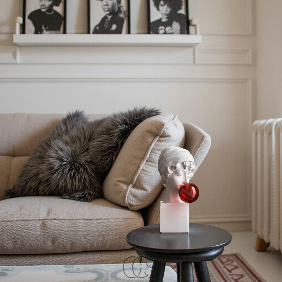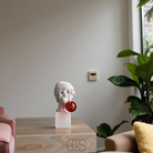 Questa statua decorativa unisce l'eleganza classica del busto romano a un tocco pop e contemporaneo.