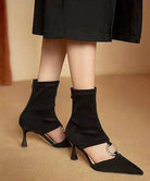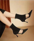 Questi stivaletti a calzino con tacco a spillo e dettaglio gioiello uniscono comfort e femminilità in un design moderno.