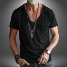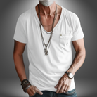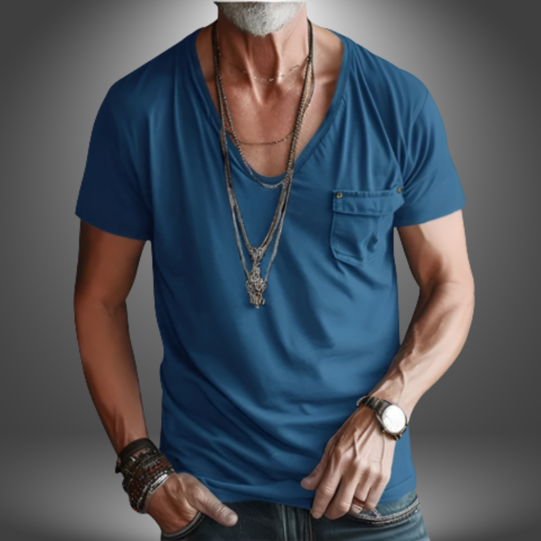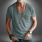 Questa t-shirt con taschino decorativo e scollo profondo è l’ideale per un look rilassato ma distintivo.