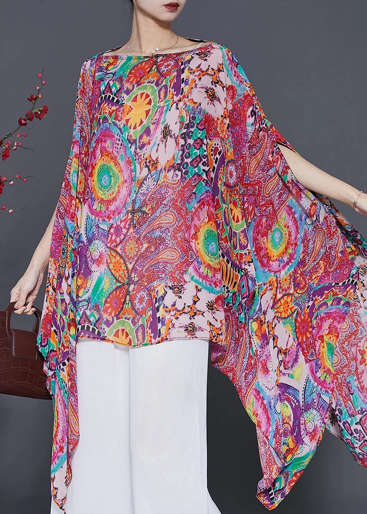 Questa tunica in chiffon multicolore conquista con la sua fantasia vivace e il taglio ampio e fluido.