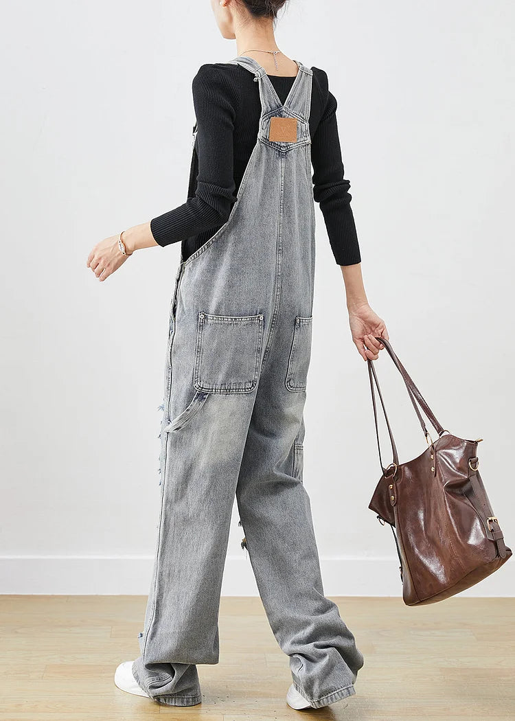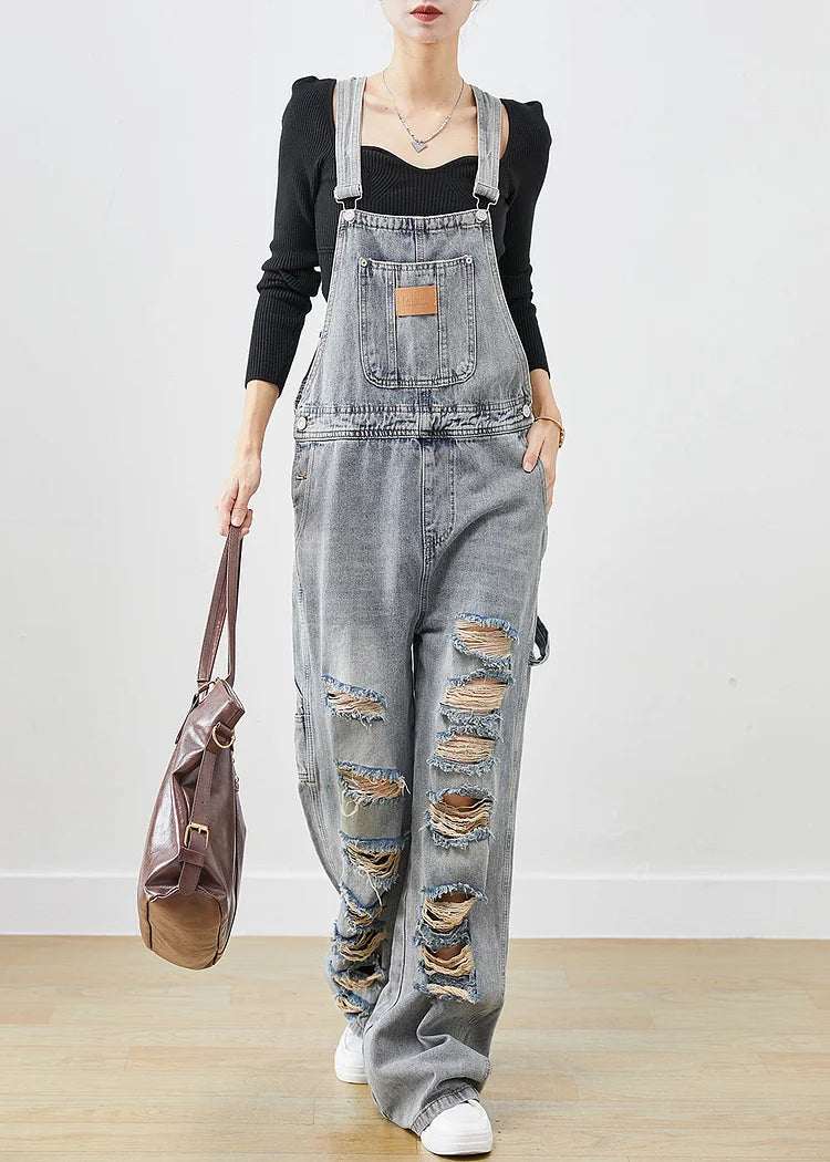 • Design: Tuta intera in denim grigio con strappi marcati e lavaggio vintage