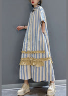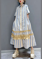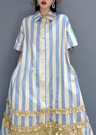 Questo abito chemisier a righe è una scelta fresca e audace, perfetta per chi ama distinguersi con un tocco giocoso.