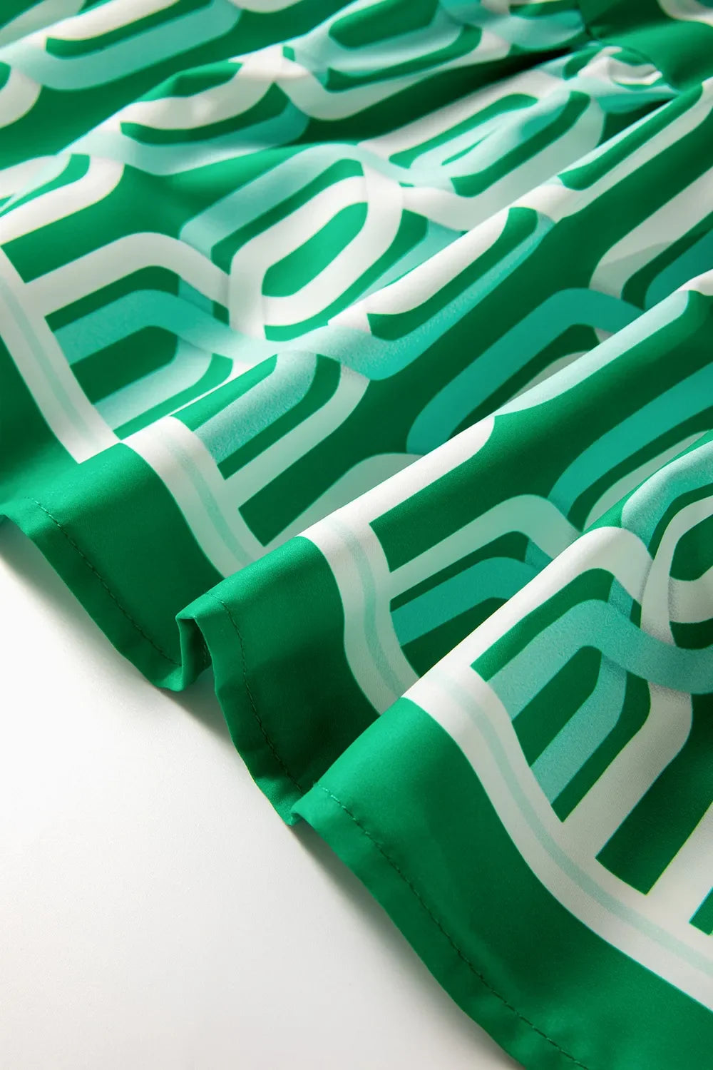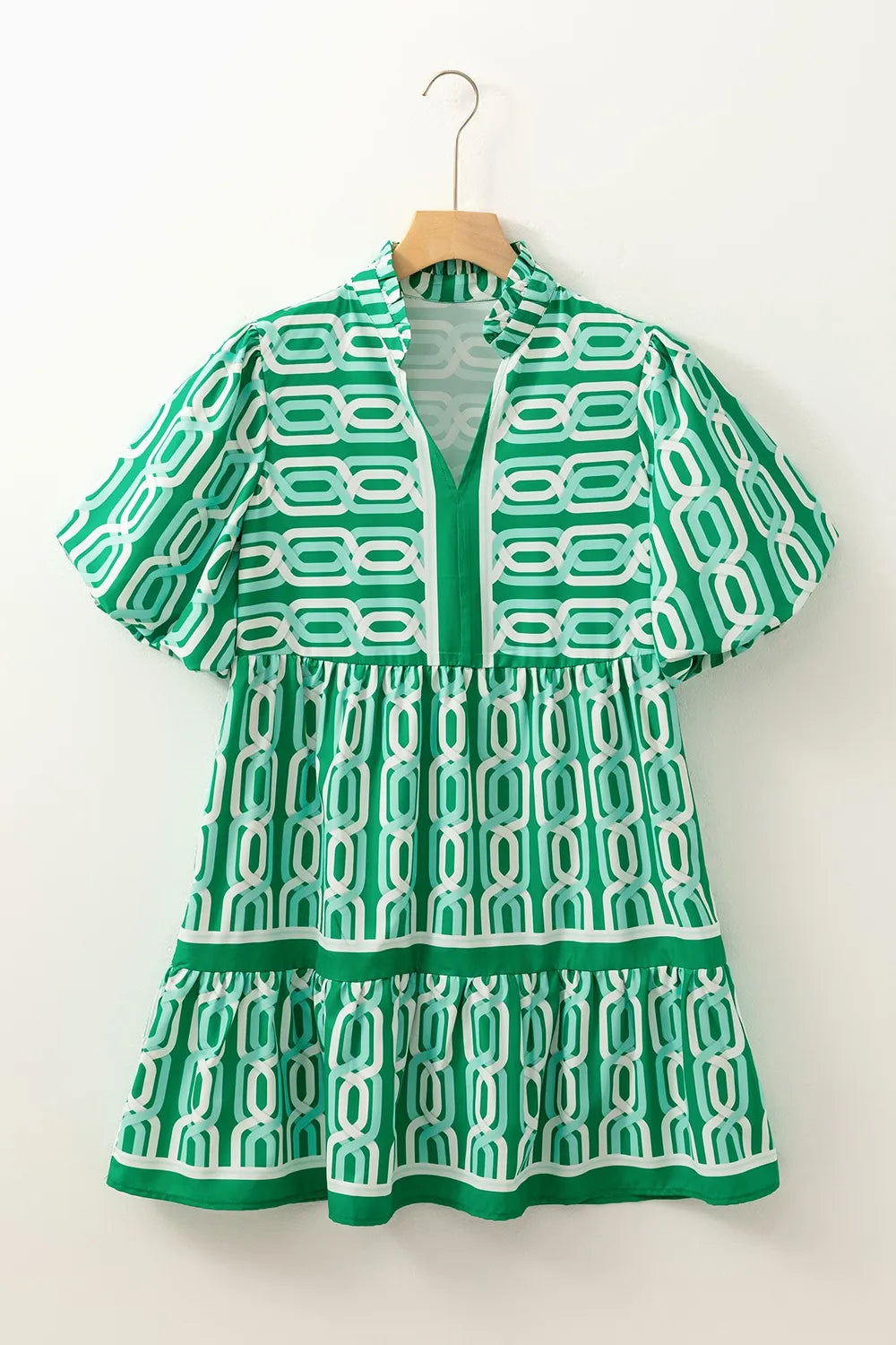 Questo vestito corto a balze con stampa geometrica verde è il mix ideale di eleganza e vivacità. Le maniche a palloncino donano volume e movimento, mentre il colletto alla coreana con scollo a V aggiunge un tocco sofisticato.