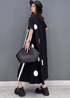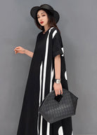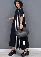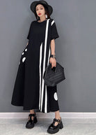 Questo vestito lungo nero con dettagli grafici bianchi è perfetto per chi ama lo stile contemporaneo e vuole distinguersi con eleganza.