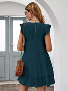 Questo vestito corto con volant sulle maniche unisce eleganza giocosa e semplicità raffinata.